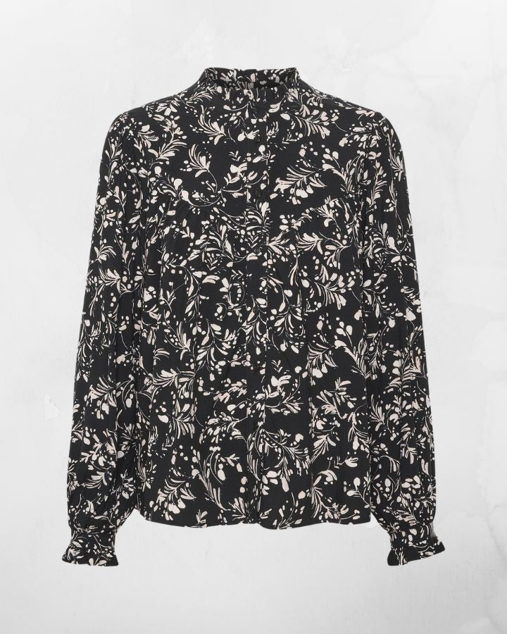 Chemisier, manche longue, petit col montant avec frison, boutonnage pleine longueur, belle aisance.