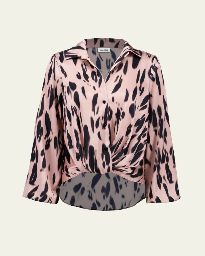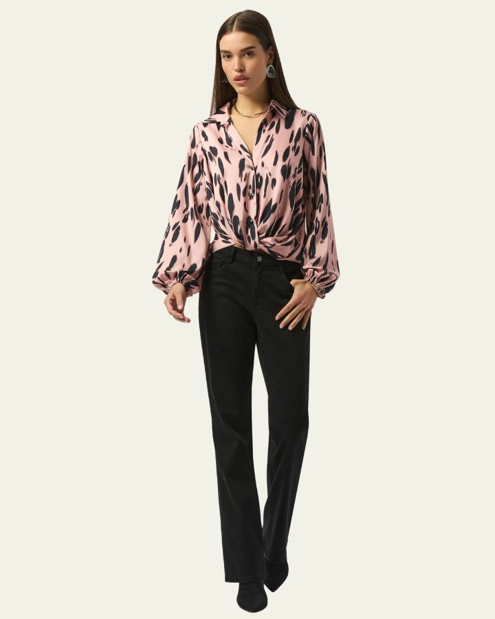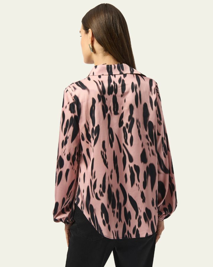 Confectionné dans un satin martelé recyclé au superbe imprimé animalier, il séduit par sa coupe soignée et son allure audacieuse. Son col chemisier structuré et ses manches longues bouffantes lui confèrent une touche de raffinement, idéale pour rehausser n’importe quelle tenue.