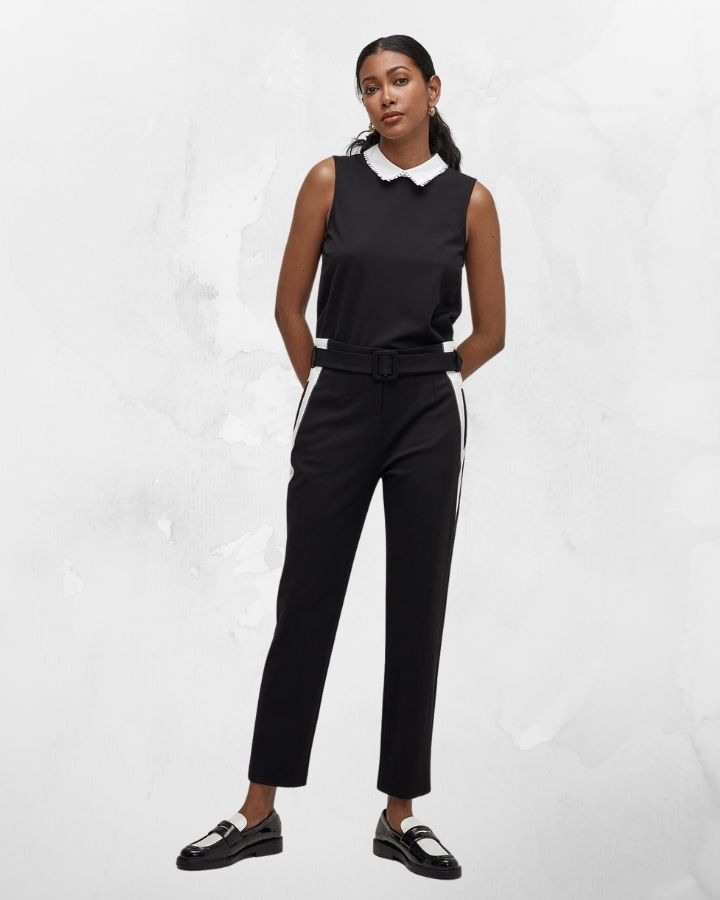Pantalon droit à fermeture éclair. Comporte un jeu de couleurs aux latérales. Avec ceinture. Pleine longueur.