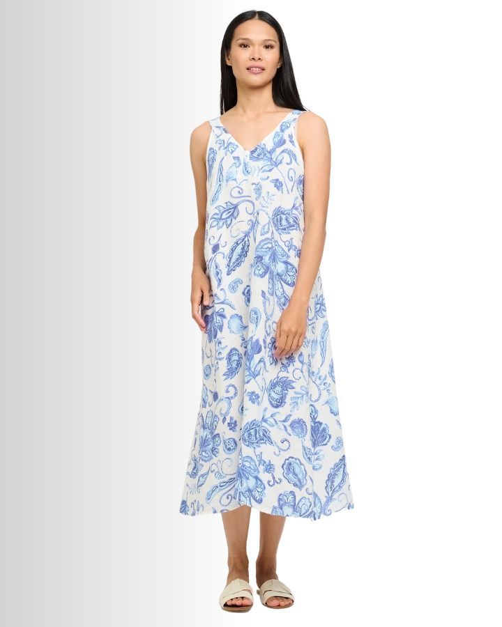 Découvrez notre robe longue sans manche en lin avec imprimé estival azur. Cette robe sans manches présente un col en V profond et un motif complexe de fleurs et de paisley bleu sur un fond blanc immaculé. Fabriquée dans un tissu léger et respirant, elle est parfaite pour les journées chaudes. Sa coupe ample et fluide offre un confort inégalé tout en garantissant une allure élégante et décontractée.