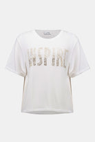 Ce t-shirt uni présente un imprimé audacieux avec des accents de strass à l'avant, créant une pièce stylée qui convient à toute sortie décontractée. Les manches trois-quarts ajoutent une touche intemporelle, les rendant aussi élégantes que confortables.