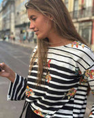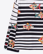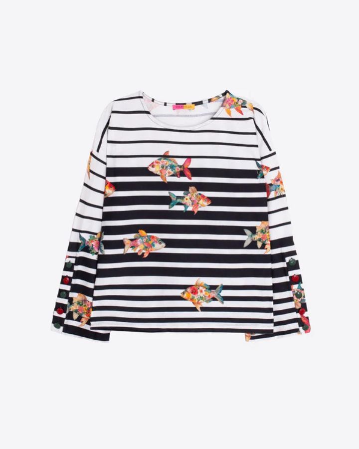 T-shirt rayé noir et blanc à imprimé poissons multicolores. Col rond, manches longues et boutons imprimés aux poignets. Vous devez commander les tailles inscrites entre ( ).