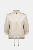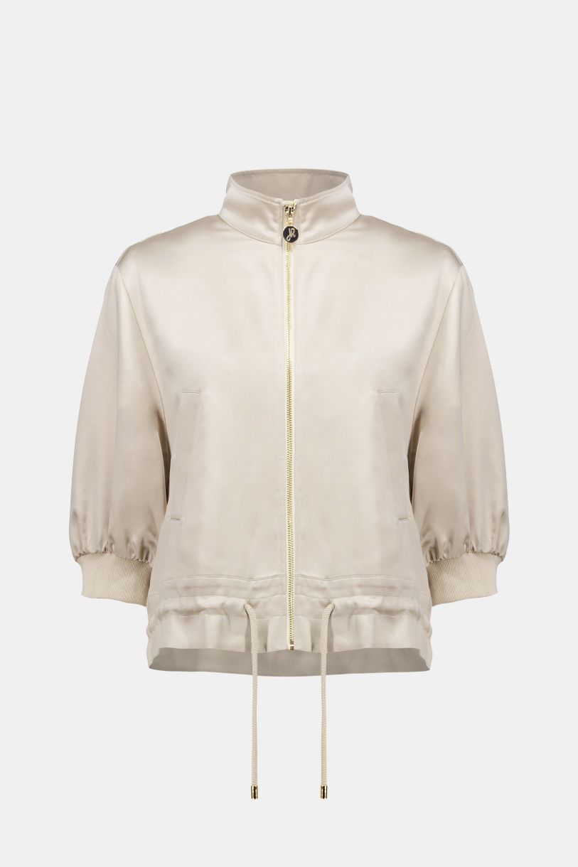 Ce blouson boxy en satin présente un col entonnoir, des manches trois-quarts montées bas avec manchettes côtelées, et un ourlet à cordon coulissant. Doté d’une fermeture éclair métallique à l’avant et de fausses poches, il offre une coupe moderne et décontractée.