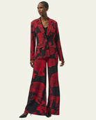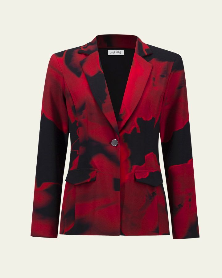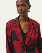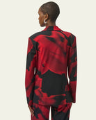 Ce blazer au motif abstrait rouge et noir est une pièce forte qui attire tous les regards. Sa coupe ajustée, son col à revers classique, et son fermoir à un bouton soulignent une silhouette élégante et contemporaine. Il est doté de deux poches à rabat à l'avant pour une touche pratique sans compromis sur le style. Parfait pour créer un look audacieux en journée comme en soirée, porté sur un haut uni ou une robe minimaliste.